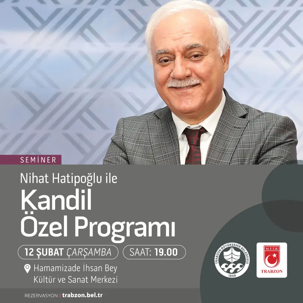 Trabzon Büyükşehir Belediyesi'nin şubat ayı kültür sanat etkinlikleri kapsamında, Nihat Hatipoğlu ile Berat Kandili programı düzenlenecek.