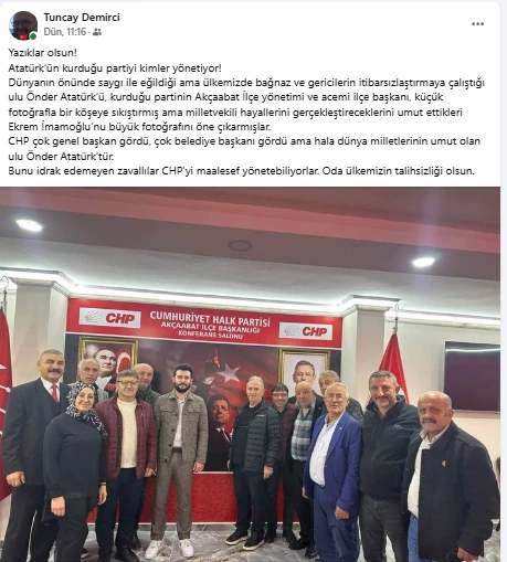 Demirci, paylaşımında “Yazıklar olsun! Atatürk’ün kurduğu partiyi kimler yönetiyor! Dünyanın önünde saygı ile eğildiği ama ülkemizde bağnaz ve gericilerin itibarsızlaştırmaya çalıştığı ulu Önder Atatürk’ü, kurduğu partinin Akçaabat İlçe yönetimi ve acemi ilçe başkanı, küçük fotoğrafla bir köşeye sıkıştırmış ama milletvekili hayallerini gerçekleştireceklerini umut ettikleri Ekrem İmamoğlu’nu büyük fotoğrafını öne çıkarmışlar. CHP çok genel başkan gördü, çok belediye başkanı gördü ama hala dünya milletlerinin umut olan ulu Önder Atatürk’tür. Bunu idrak edemeyen zavallılar CHP’yi maalesef yönetebiliyorlar. Oda ülkemizin talihsizliği olsun.” Paylaşımında bulundu.” İfadelerine yer verdi.