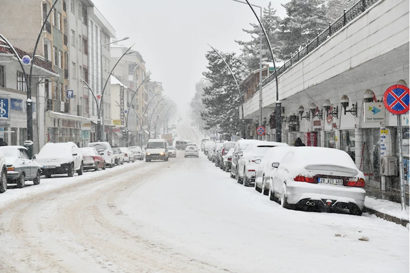 Kar yağışıyla kent merkezi beyaza büründü, cadde ve sokaklar ile park halindeki araçlar karla kaplandı.
