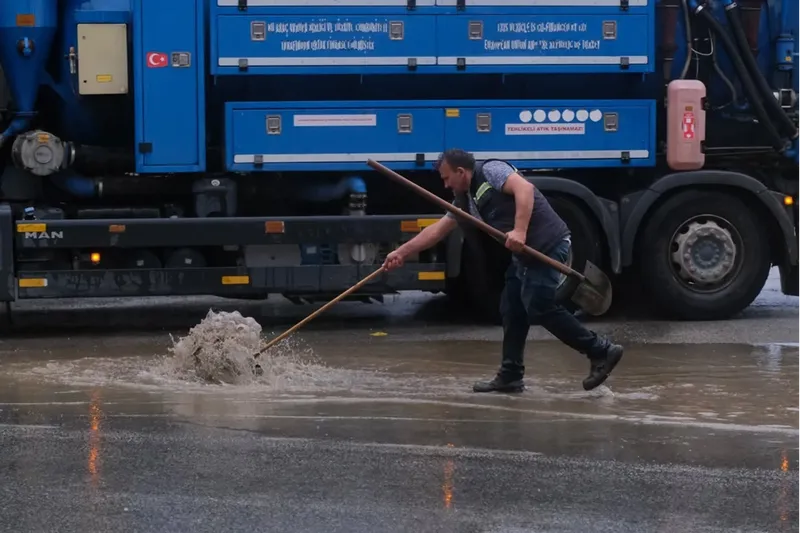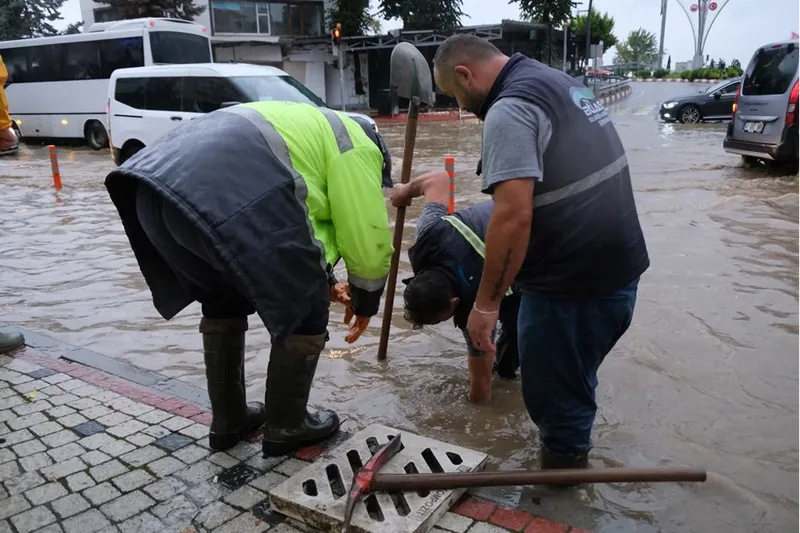 Belediye ekipleri, cadde ve sokaklarda biriken suyu tahliye etmek için çalışmalarını sürdürüyor.