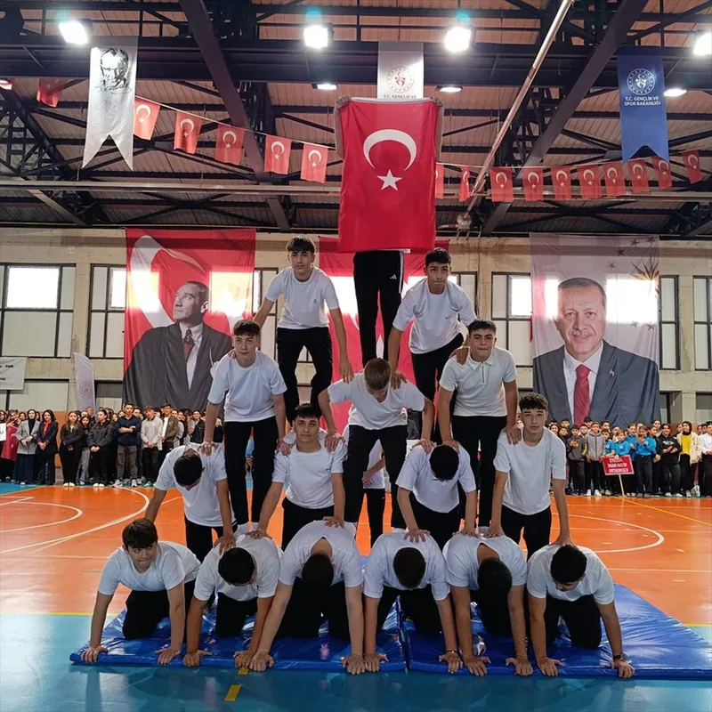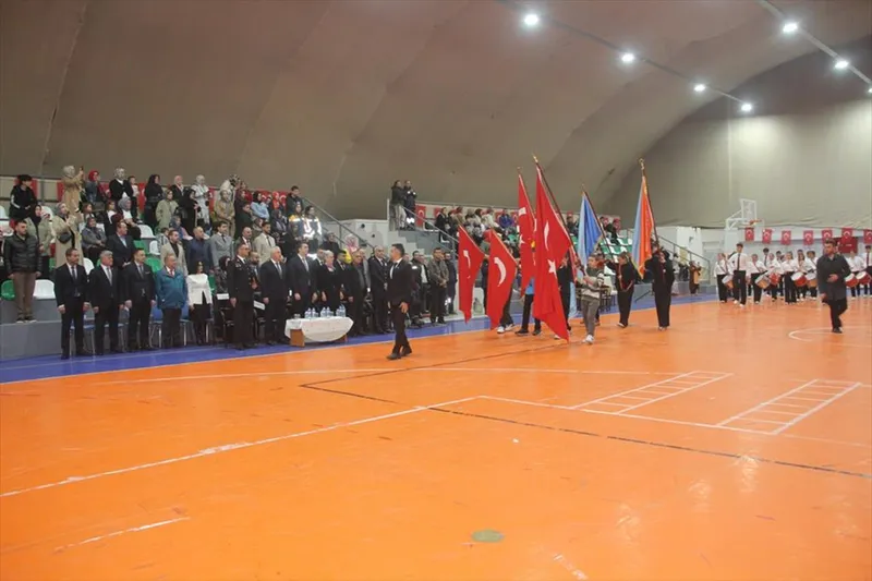 Güce İlçe Spor Salonu'nda düzenlenen tören, saygı duruşunda bulunulması ve İstiklal Marşı'nın okunmasıyla başladı.