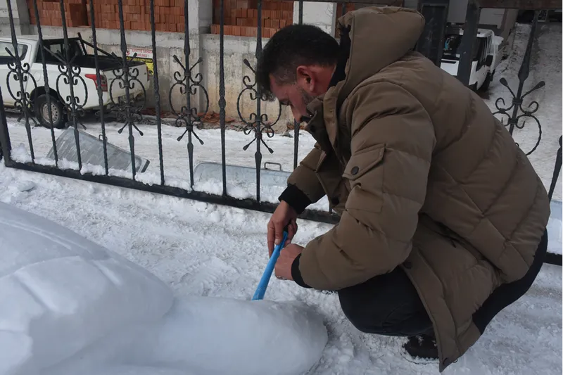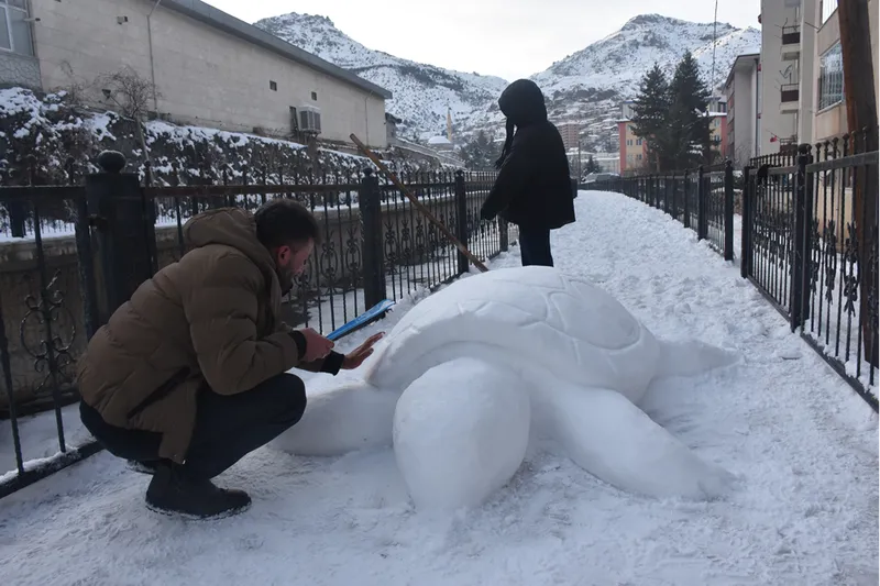 Oral, kentte etkili olan soğuk hava ve kar yağışının ardından Hasanbey Mahallesi Cumhuriyet Caddesi'ndeki yürüyüş yolu üzerinde kardan kaplumbağa yapma kararı aldı.