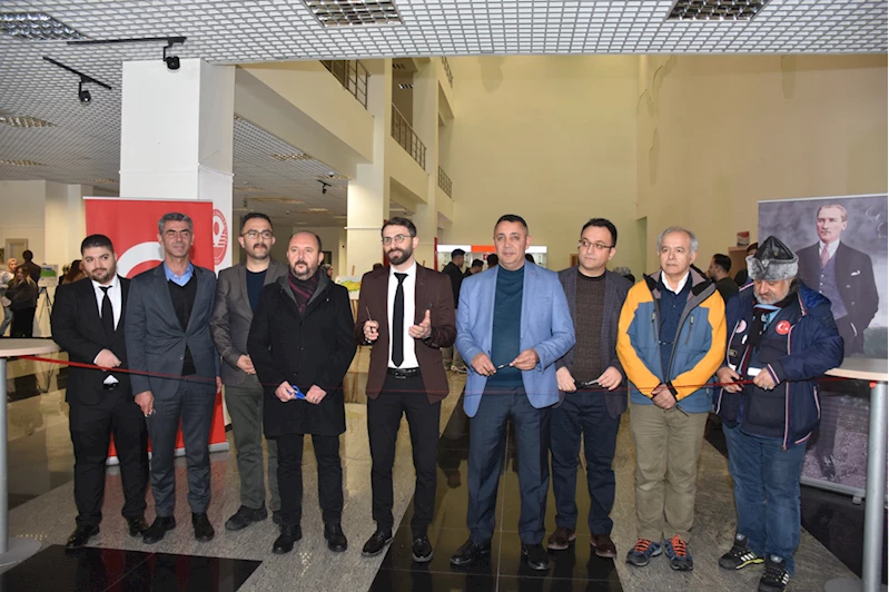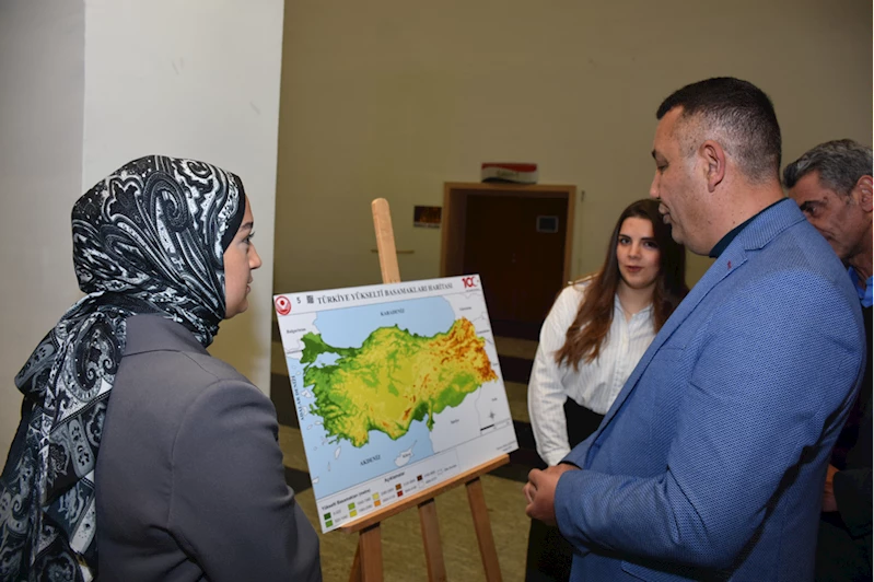 Coğrafya Bölüm Başkanı Dr. Öğr. Üyesi Fatih Işık, Dr. Mustafa Çalık Kongre Merkezi'nde "Koordinatlarımız Gelecek, Yönümüz Türkiye Yüzyılı" temalı sergi hakkında katılımcılara bilgi aktardı.