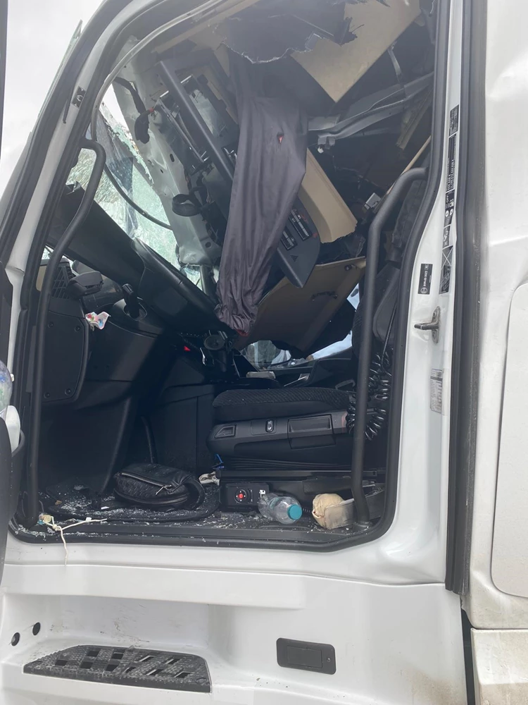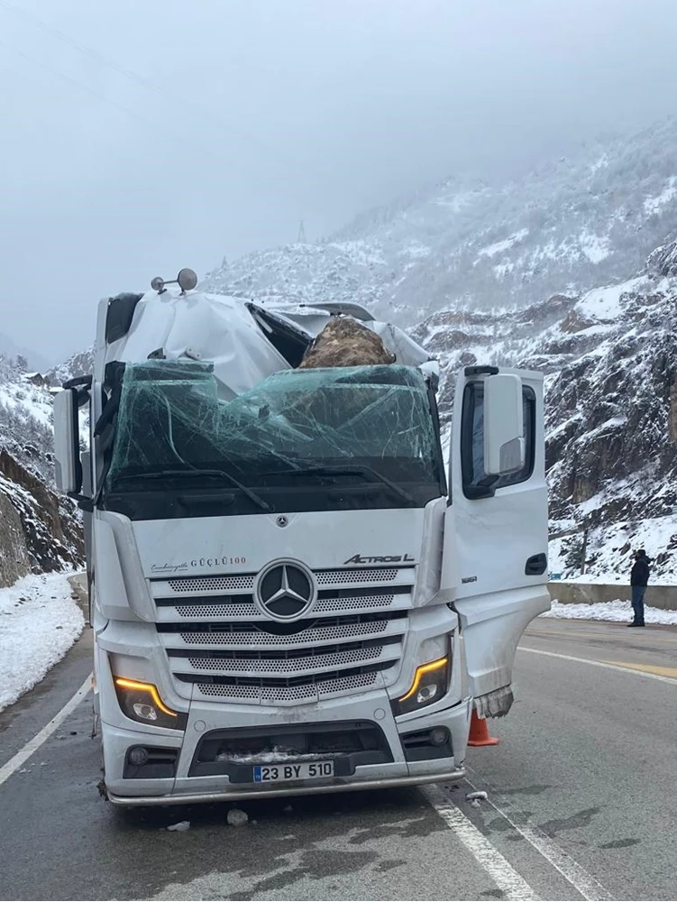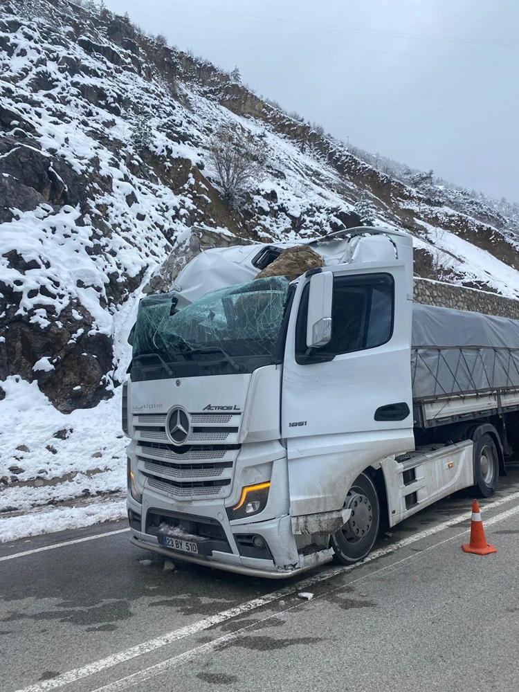 İlçeye bağlı Kiraz köyü mevkisinde Yunus O. idaresindeki 23 BY 510 plakalı tırın kupasının üzerine yamaçtan kopan kaya parçası düştü.