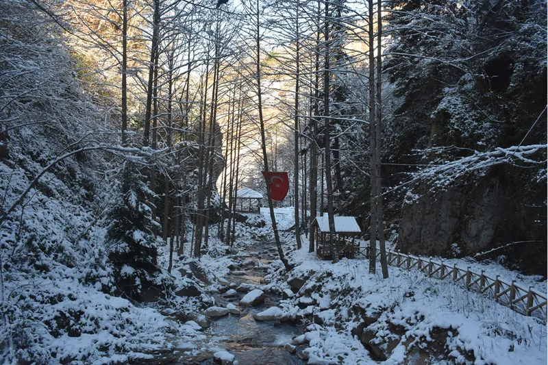 Bölgede son günlerde aralıklarla etkili olan yağışla beyaza bürünen Çağlayandibi Şelalesi Tabiat Parkı, her mevsim ziyaretçilerin ilgisini çekiyor.