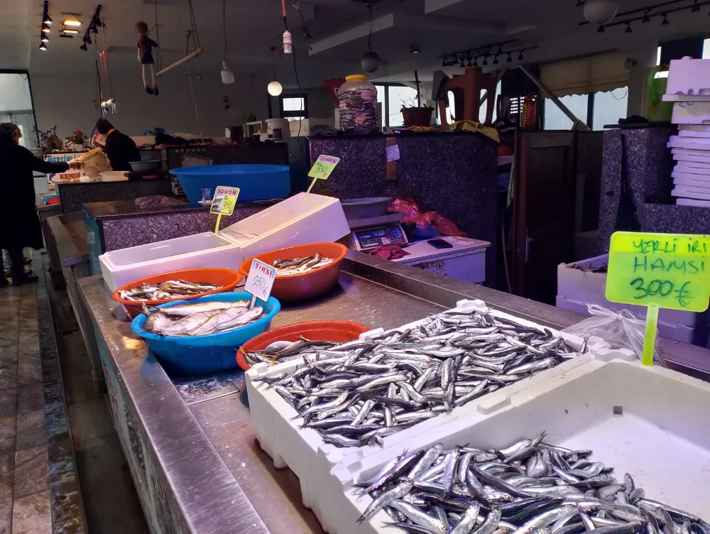 Balıkhanede hamsinin kilogram fiyatı 300 liradan alıcı bulurken, istavrit 150 lira, tirsi 250 lira, somon 350 lira ve levrek ise 550 liradan satılıyor.