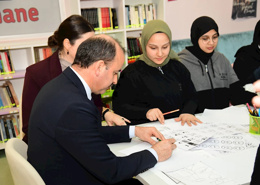 Okul öğrencilerinin ve öğretmenlerinin hummalı bir çalışma ortaya koyarak topladıkları ikinci el kitaplardan oluşan sahafın açılış kurdelesini kesen ve sahaftaki kitapları inceleyen İl Müdürü Uygun, daha sonra karikatür atölyesinde çalışan öğrencilerle birlikte çizim yaptı.