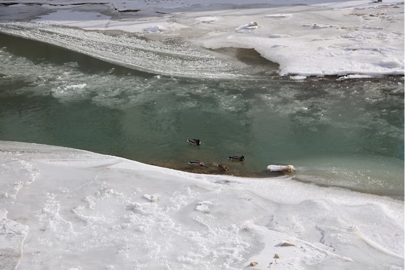 Kent merkezinden geçen Çoruh Nehri'nin bazı kısımları dondu. Nehrin donmayan bölümünü kullanan yeşilbaş ördeklerin, yavrularıyla birlikte yiyecek aradığı görüldü.