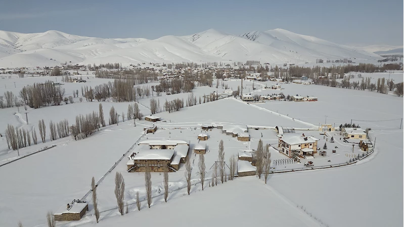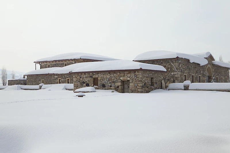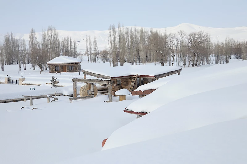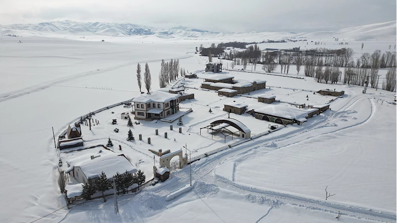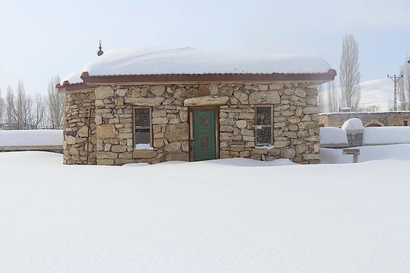 Envanterinde eski sosyal yaşamı anlatan araç gereçler, taş ve ahşabın buluştuğu mimari yapılarla Anadolu'nun güzelliklerini anlatan Beşpınar köyündeki Kenan Yavuz Etnografya Müzesi de yağış sonrası karla kaplandı.