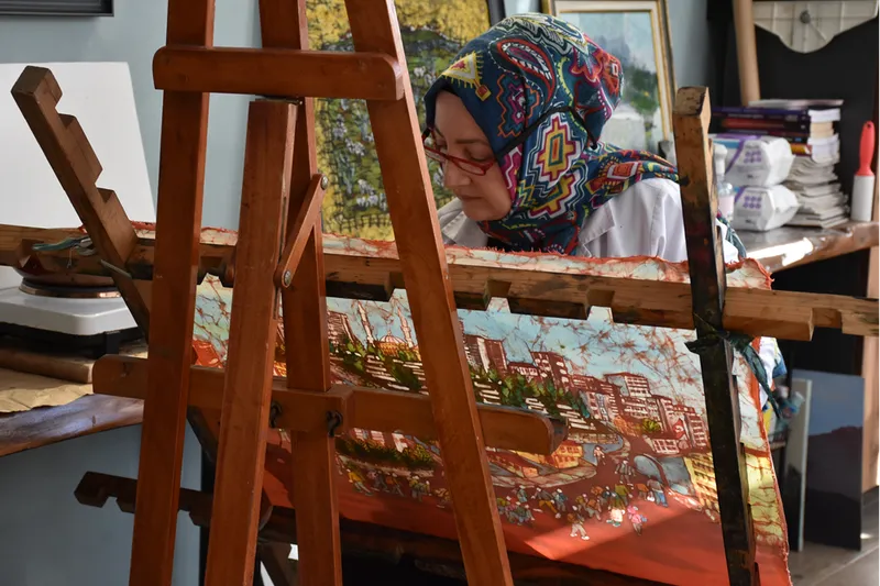 Şehrin doğasının, yaptığı eserler için çıkış noktası olduğunu vurgulayan Eroğlu, "Her bakış, her gözlem bir tabloya dönüşebiliyor. Kalple, gözle, beyinle bunları önce kağıda işliyorsun." diye konuştu.