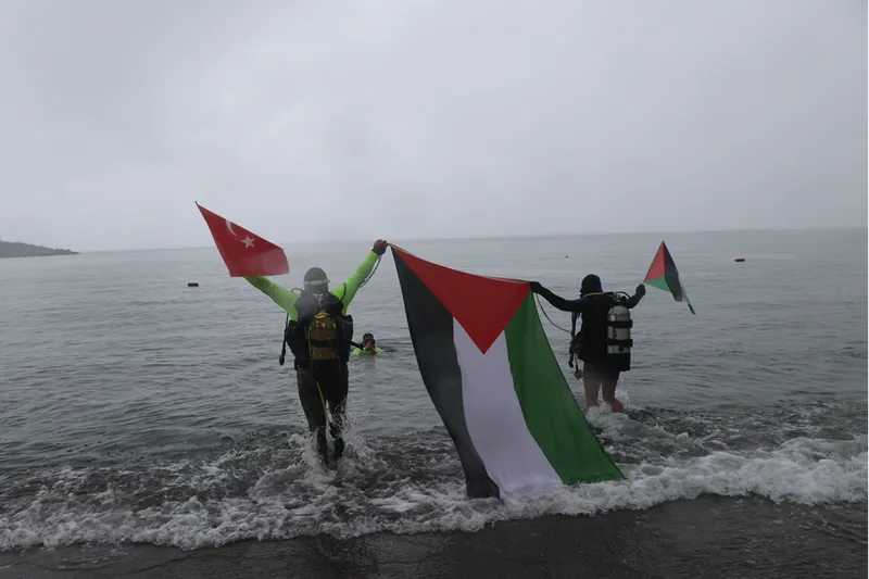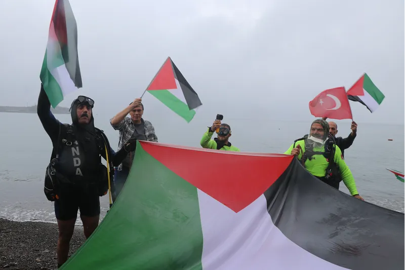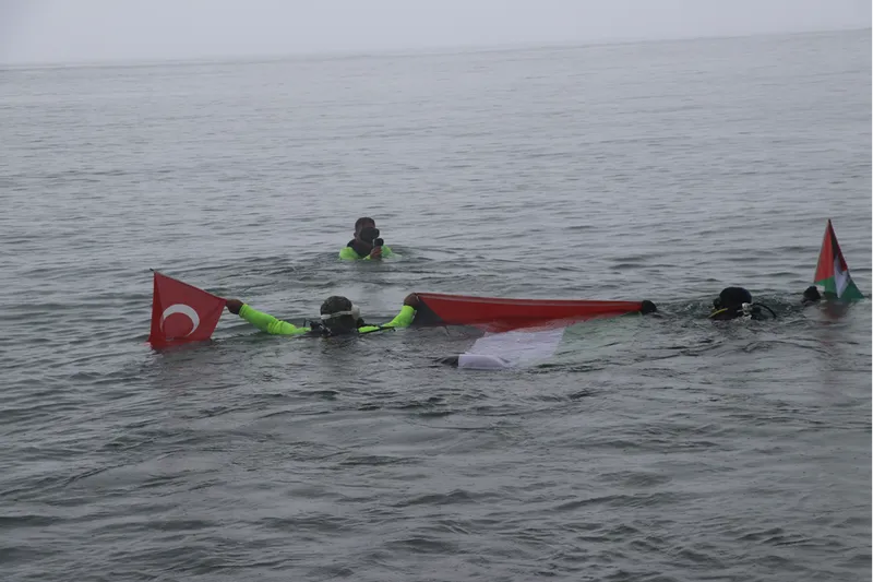 Bir süre deniz altında gezen Ersoy ve Koçal, Türk ve Filistin bayrakları açtı.