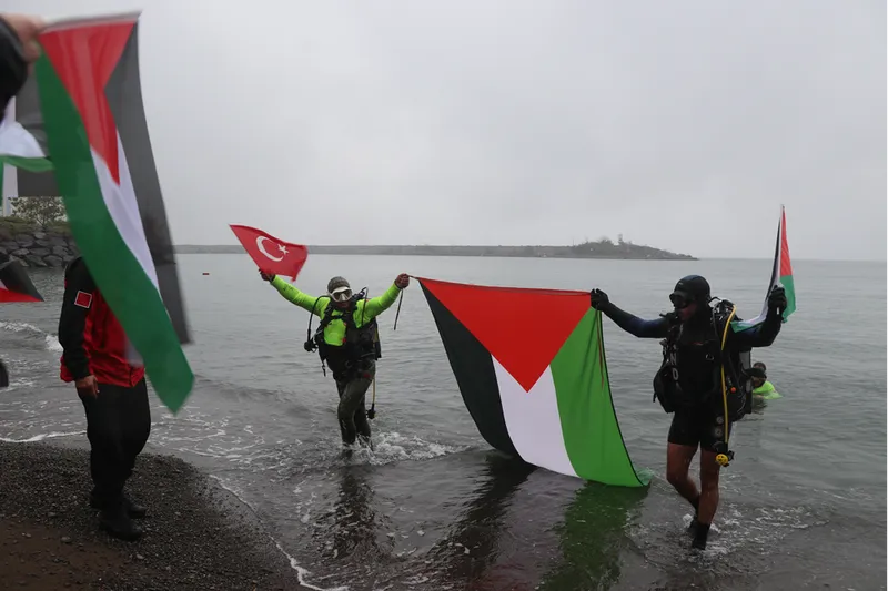 RİZE (AA) - Eğitim Araştırma Yardımlaşma ve Arama Kurtarma Derneği (ANDA) Trabzon İl Başkanı Yunus Ersoy ile ekip amiri Zafer Koçal, İsrail'in Gazze'ye saldırılarına dikkati çekebilmek için Karadeniz'de dalış gerçekleştirdi.