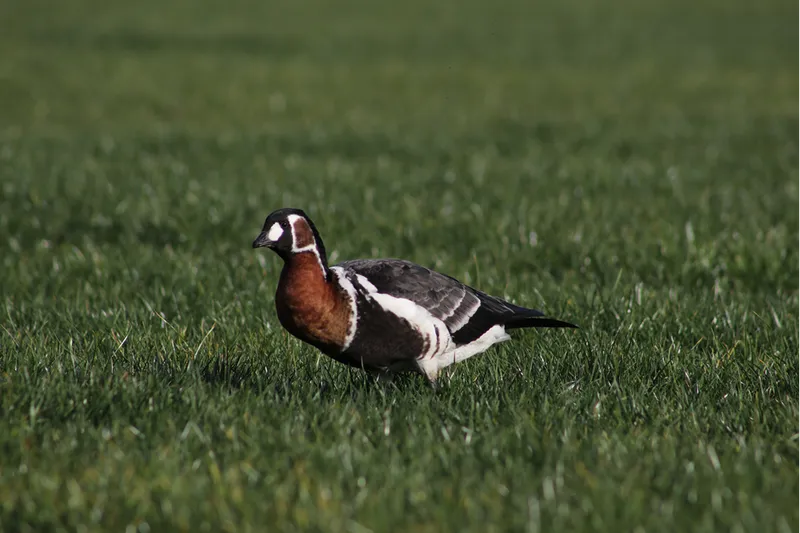 Kahverengi, siyah ve beyaz renkteki tüyleriyle dikkat çekici bir görünüme sahip Sibirya kazı, sahil kesimindeki yeşil alanda gözlemlendi.