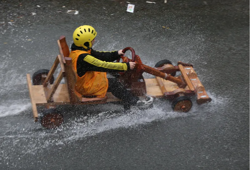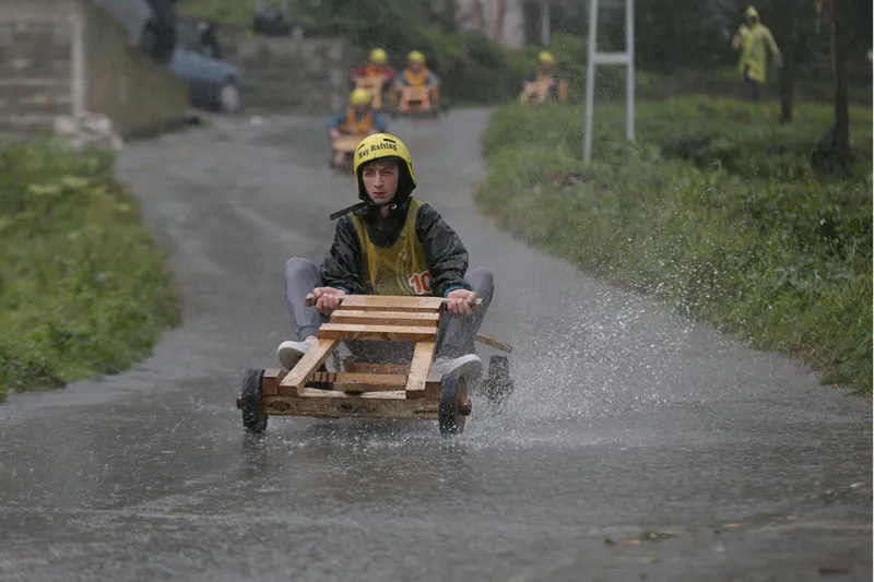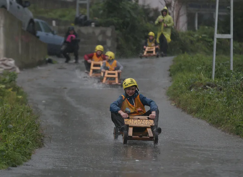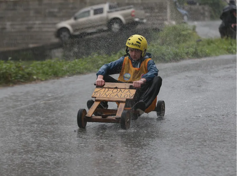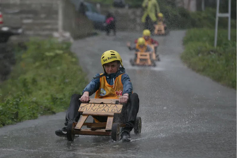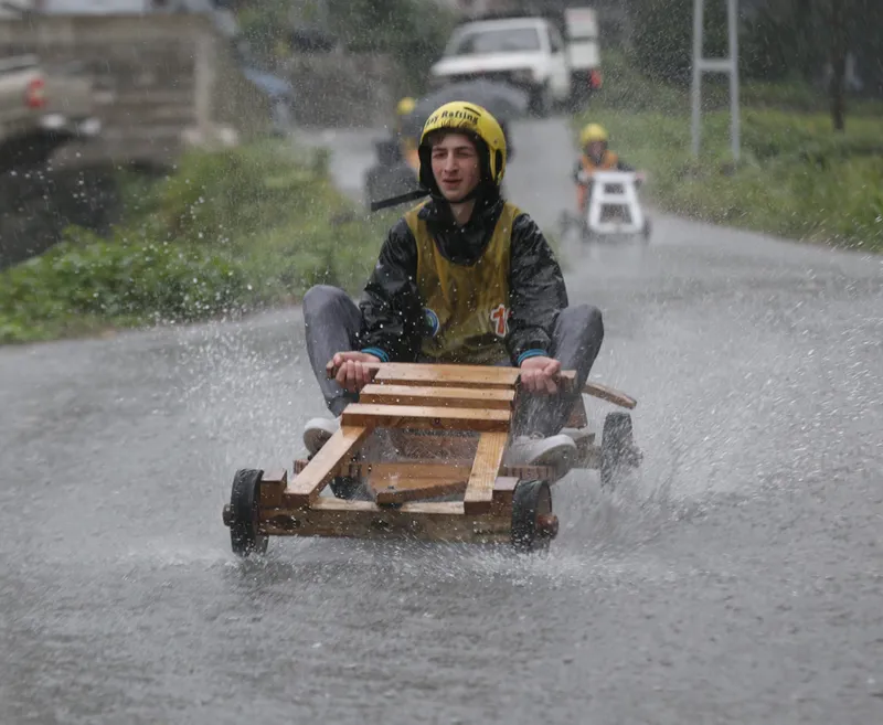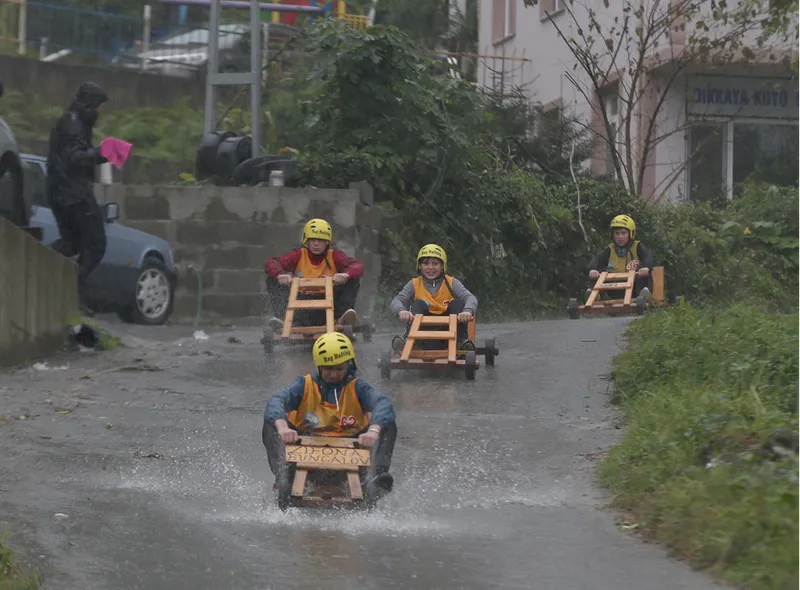 Olası kazalara karşı güvenlik önlemleri alınan yarış pistinin tehlikeli bölümlerine saman balyaları yerleştirildi. Yağışlı havada zor anlar yaşayan bazı yarışmacıların, tahta arabalarını iterek bitiş çizgisine ulaşmaya çalıştıkları görüldü.