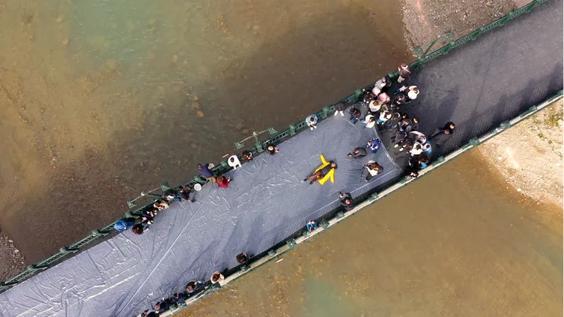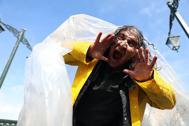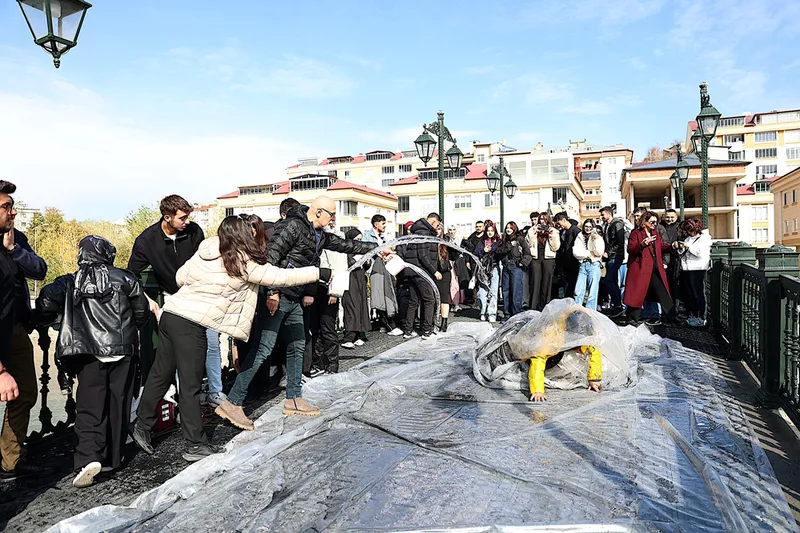 Daha sonra bedenine sardığı naylonla nehirden aldığı suyu üzerine döken sanatçı, performansıyla vatandaşların da dikkatini çekti.