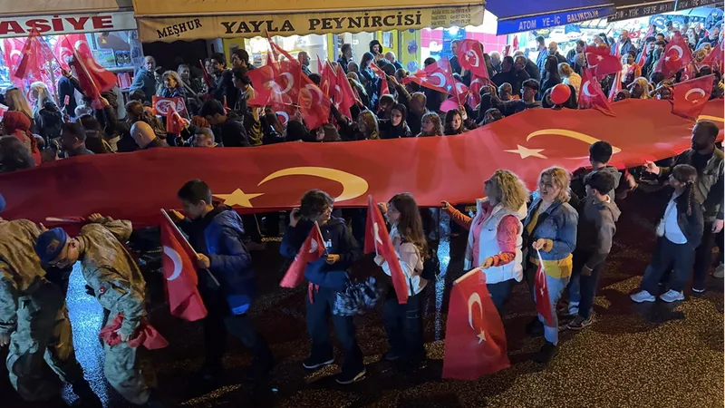 Gümüşhane'de düzenlenen fener alayı etkinliğinde, Hasanbey Mahallesi'nde bir araya gelen katılımcılar, ellerinde Türk bayraklarıyla Karaer Mahallesi'ne yürüdü.
