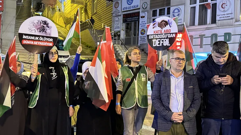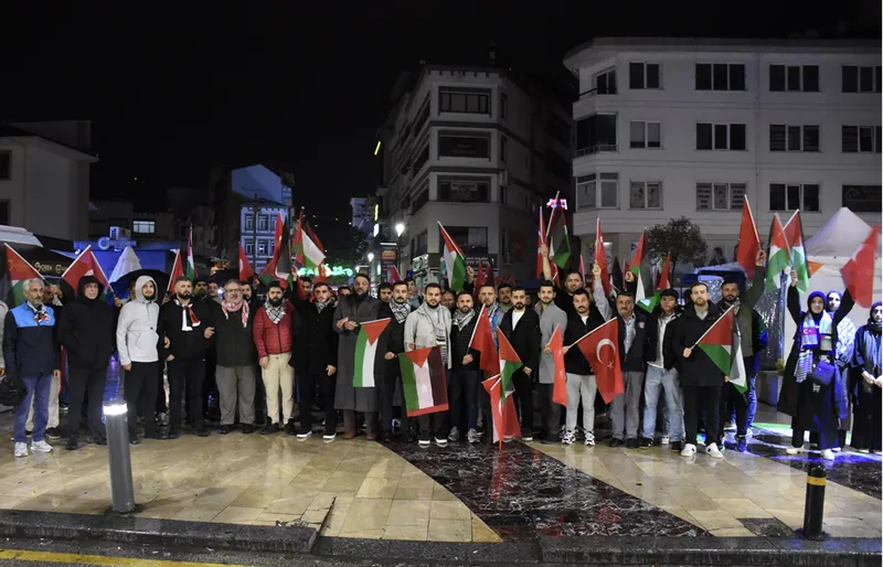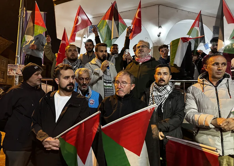 Artvin'de İnsan Hak ve Hürriyetleri (İHH) İnsani Yardım Vakfı Artvin Şube Başkanlığı'nın sosyal medya hesapları üzerinden yaptığı çağrı üzere bir grup vatandaş, ellerindeki Türk ve Filistin bayraklarıyla Halitpaşa Meydanı'nda toplandı.