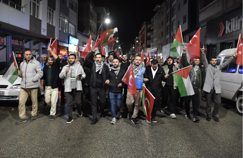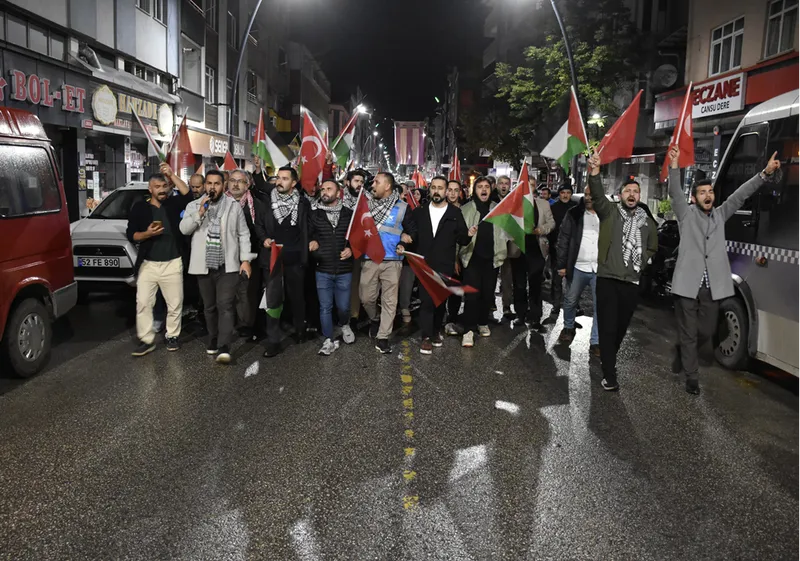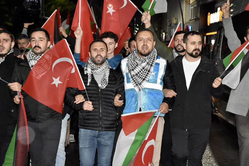 Ellerindeki Türk ve Filistin bayraklarıyla İsrail aleyhine slogan atan gruptakiler, Zübeyde Hanım Caddesi'nden İmam Hatip Camisi'ne kadar yürüdü.