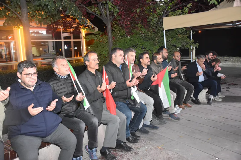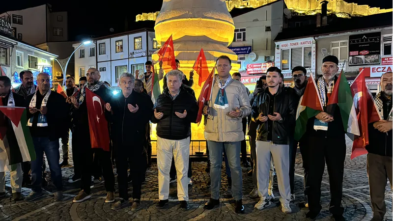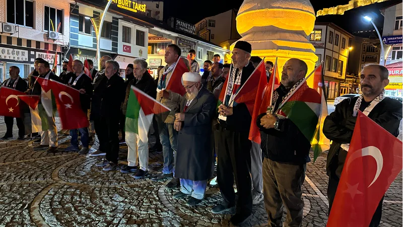 Bayburt'ta da Saat Kulesi Meydanı'nda toplanan vatandaşlar, ellerinde Türk ve Filistin bayraklarıyla tekbir getirdi, slogan attı.
