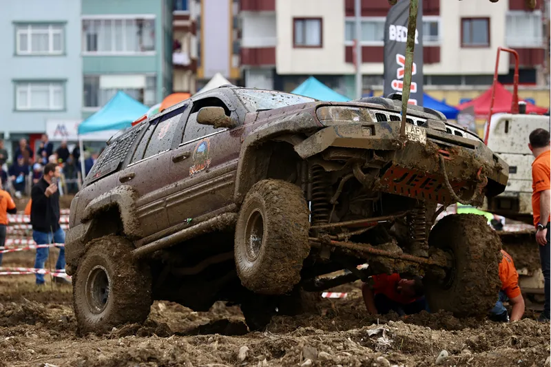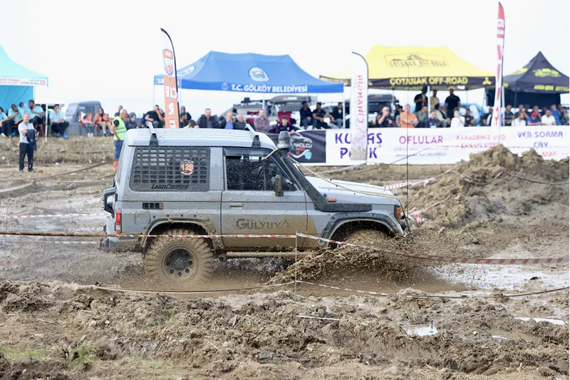 İlçe stadının yanındaki alanda düzenlenen festivalde, çamurlu parkurda zorlu engelleri geçerek ilerleyen ekipler, yarışı en kısa sürede bitirmek için mücadele etti.