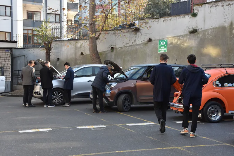 Bu kapsamda öğrenciler, okulda öğrendiklerini öğretmenlerinin, servislerin ve diğer resmi araçların antifriz, fren lambası, silecek suyu, boya kalınlığı, yağ, lastik diş derinliği, far, sinyal, fren ve geri viteslerini kontrol ederek pratiğe döküyor.