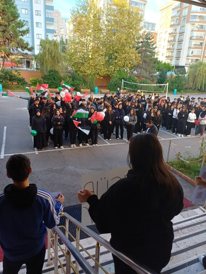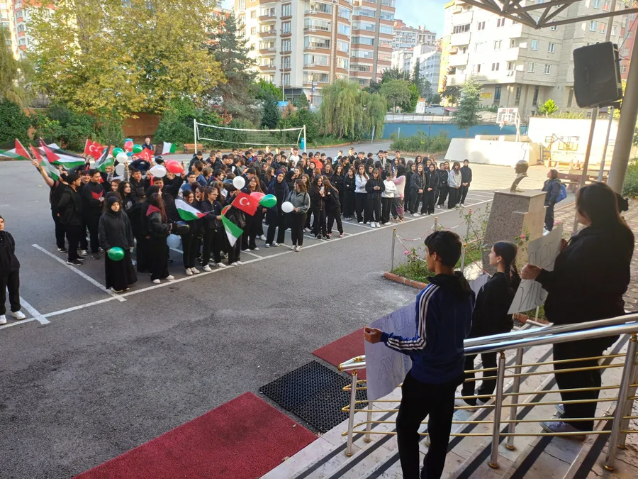 Okulun Rusça Öğretmeni Betül Babacan’ın organize ettiği etkinlikte sabah töreni için toplanan öğrenciler ellerindeki Filistin bayrakları ile “Leve Palestina” isimli şarkıyı seslendirdiler. Bazı öğrenciler de “Özgür Filistin” ve “Kudüs özgür değilse dünya tutsaktır” sloganlarının yazıldığı pankartlarla Filistin sorununa dikkat çektiler.