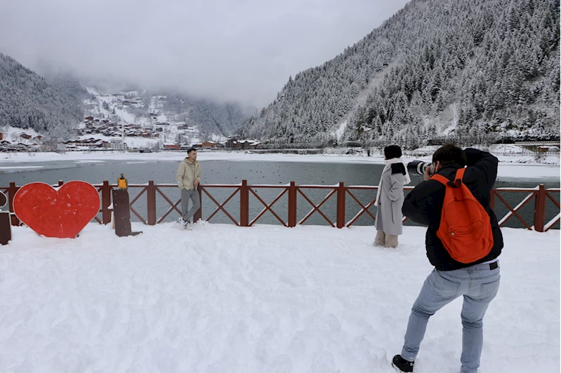 Doğayla baş başa sakin bir gün geçirmek için Uzungöl'e gelen ziyaretçiler, yüzeyi buz tutmuş gölün fotoğrafını çekerek manzarayı izledi.