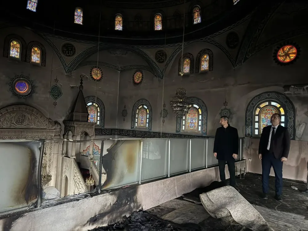 çıkan yangın sonucu büyük hasarın meydana geldiği Kavaklı Mahallesi Güney Mevkii Merkez Camii’nde incelemelerde bulundu.