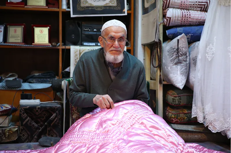 "Şerafettin dede", iğne ve ipliğiyle 72 yıldır dolgusu pamuk veya yün olup bölgede hala talep gören saten yorganları titizlikle işliyor.
