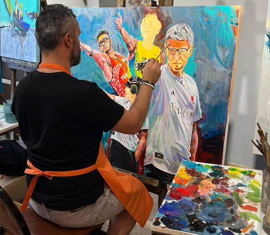 “Sporcu başarılı mı? Evet başarılı, gümüş madalya aldı. O bir etken tabi. Ama esas etken, o hareketinin sürekli bütün sporcular tarafından kayıtsız, şartsız, ön yargısız bir şekilde dünyada ikon haline gelmiş olması ve sporcularında aslında bunu egosuz bir şekilde kullanması. İsveçli sporcu, Armand Duplantis kendi rekorlarını alt üst ediyor ama o bile gümüş madalya almış birisinin hareketini hoşuna gitmesinden dolayı Olimpiyatlar gibi bir mecrada sergiliyor. Bunun yanında onlarca sporcu olimpiyatlar haricinde günümüzde yapılan spor karşılaşmalarında mesela; gol attıktan sonra tribüne gidip o hareketi yapıyor. Tüm sanat ve spor camiasında ünlü kişilerin, sosyal medya platformlarını kullananlar dahil pek çok kişi bir ikon haline haline gelen sporcunun hareketini yaptığını görmek etkili oldu ve bunu bende vurgulamak istedim. Ama benim burada vurgulamak istediğim şeylerden bir tanesi de kadın sporcumuz Şevval İlayda Tarhan’ın da bu takımda olmasıydı ve onun göz ardı edilmesini istemedim ve onu da kompozisyonuma dahil ettim. O kadar erkeğin arasında bir kadın sporcuyu da koymak gerekirdi. Bu anlamda da önemliydi kendi adıma.