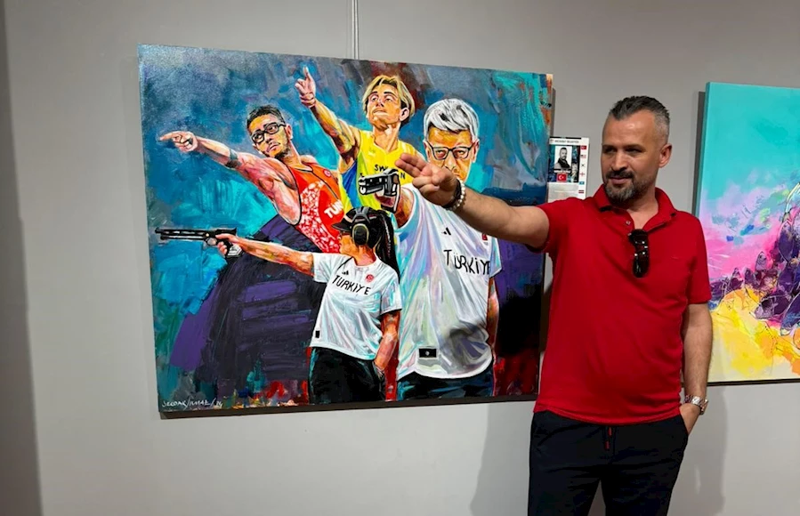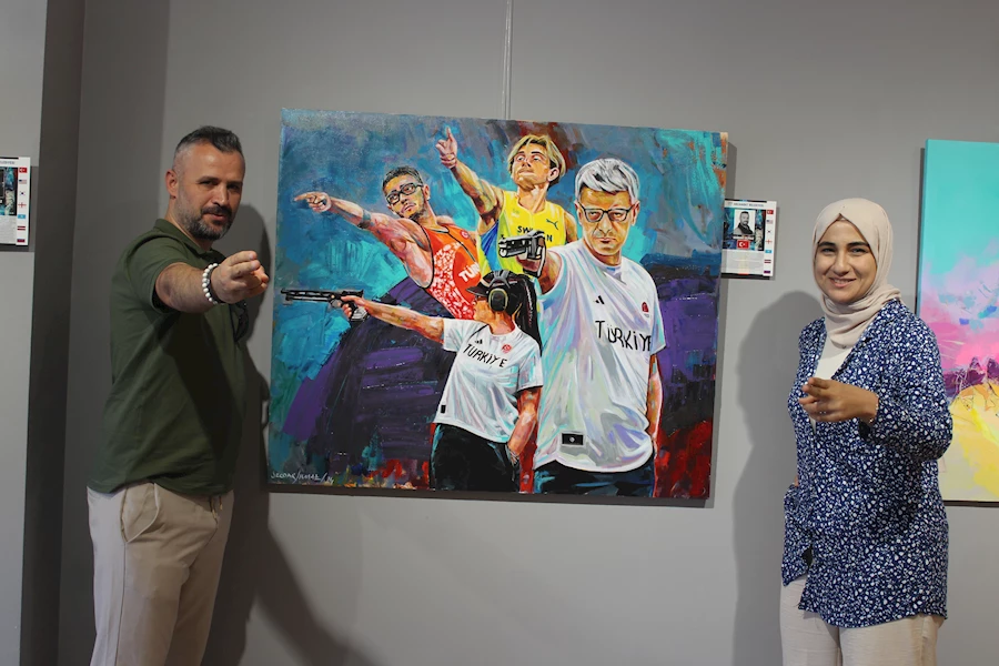“Ben, sporcu geçmişim olması dolayısıyla akademik hayatımda da spor, sanat ve siyaset ilişkisi üzerine çalışmalar yürütüyorum. Baktığımızda olimpiyatlar, Antik Yunan’da MÖ. 8. Yüzyıla kadar dayanmaktadır. Modern anlamda ise 1896’ da ilki yapılmış ve sene de 2024 Paris Yaz Olimpiyatları düzenlendi. Dört yılda bir düzenlenen ve bu zamana kadar sadece 1. Ve 2.Dünya savaşları sırasında olimpiyatlar çeşitli nedenlerden dolayı yapılamadı. Ve günümüzde de 33’sü yapıldı. Geçmişi çok eskiye dayanan bir organizasyon. Amacı dünya barışına katkı sağlamak. Kardeşliğin, dostluğun ve barışın sembolü olarak ortaya çıktı. İlk yapıldığı dönemlerde barışın simgesi olan ve o dönemlerden günümüze kadar süregelen kapsamlı bir organizasyon olan ve geçtiğimiz günlerde yapılan olimpiyatlarda bir Türk havalı tabanca atışı sporcusunun, aslında iki kişi olan bir kadın bir erkek sporcusunun ekip halinde gümüş madalya kazanması ve ikon haline gelmiş havalı duruşu ve bakışları benim bu resmi yapmam için etkili oldu. Sosyal medya platformlarında çok fazla gösterilir oldu. Dolayısıyla, bu kadar sürekli, her şekilde dönen, her açtığımızda karşımıza çıkan bu figürü, spor üzerine çalışmalar yapmam sebebiyle de tuvale aktarmak istedim. El hareketi, bakışları, duruşu vs… Hazırlanırken bu düşünce ile yola çıktım. Ama süreçte ben buna daha neler ekleyebilirim, nasıl yapabilirim, sadece onu orada tek bir figür olarak yapsak benim için bir ifade etmezdi. Ben sanatın insanı düşündürmesi gerektiğine inanıyorum. Ona katacağım öznel bakış açımla beraber biçimsel olarak boya, desen vs. onu işleyişim ve içerik olarak dediğimiz konu anlamında insanlara bir şeyler hissettirmeli, onları düşündürmeli noktasında hareket ettim ve bizim Türkiye’den 3 sporcuyu ve arka planda da İsveçli sporcuyu kompozisyona dahil ederek aslında uluslararası bir organizasyon olmasına, Olimpiyatın kardeşlik, barış ve dostluğun sergilendiği bir ortam olmasına gönderme yaptım. Beni etkileyen bu oldu. Belki başka bir sporcuyu kullanır mıydık, bu tarz bir etki olsaydı tabi ki olabilirdi. Benim için önemli olan insanların sporun güzel yönünü fark etmeleridir. Bu anlamda Yusuf Dikeç’in hareketi, havalı duruşu ve gündem olması benim için amacıma yönelik için bir araç haline geldi.”